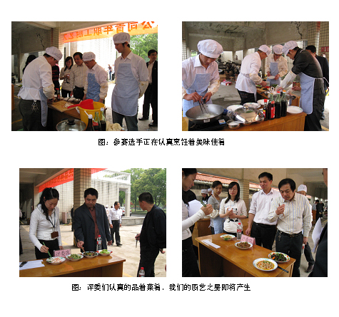 廚藝比賽按部門(mén)分為8個(gè)小組,每組由4人組成,而參賽都是35周歲以下青年員工。按規(guī)則各組選手均要在規(guī)定的時(shí)間內(nèi)完成了比賽所定的一冷菜、二小炒、一煲湯四樣菜式。較往屆此次比賽多了一項(xiàng)規(guī)定金額自選購(gòu)菜,使參賽小組烹飪的菜肴更具選擇性與特色化。